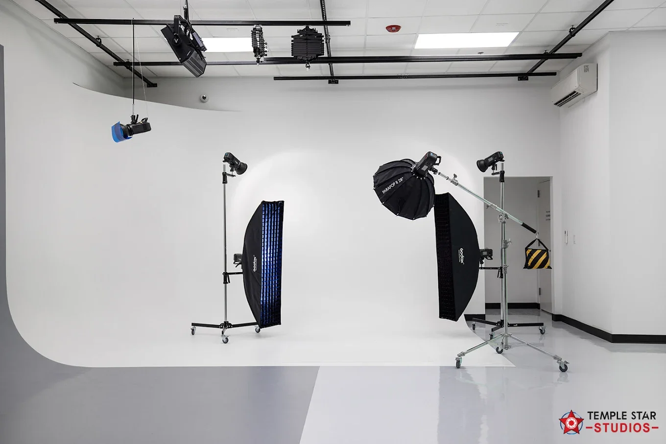 Optional Aputure RGB LED lights to turn the cyc wall any color