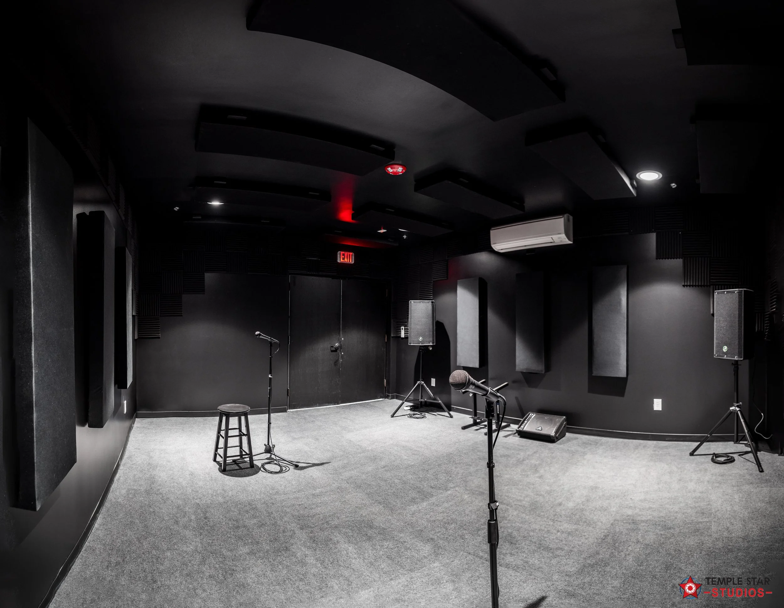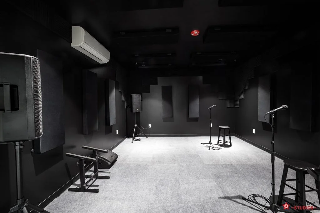 This room also comes with sound blankets on a ceiling-mounted track. We recommend moving them over the door for optimal sound treatment.